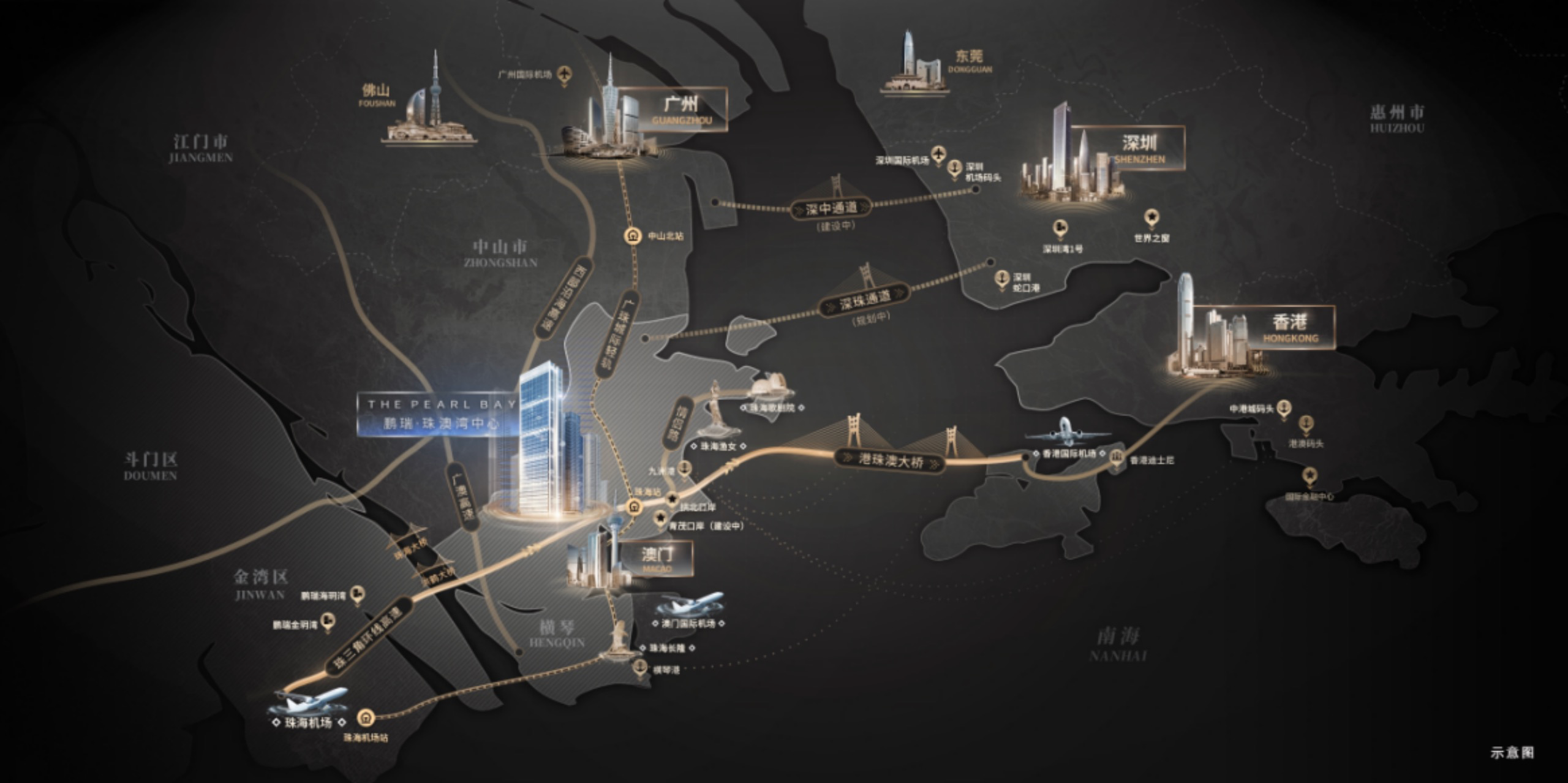 東連深港、南臨澳門、北接廣佛、西通粵西